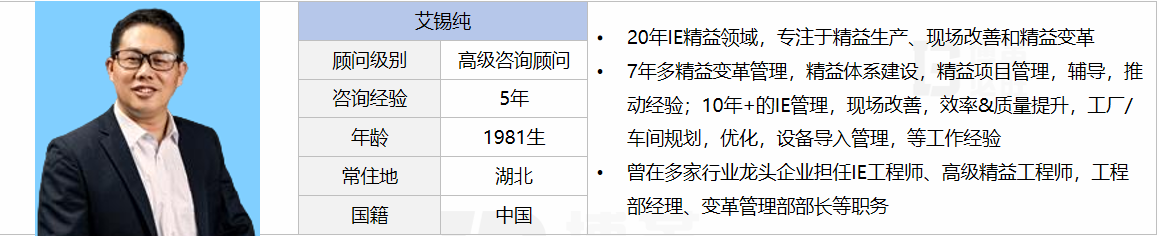 擅長(zhǎng)業(yè)務(wù):精益管理體系建設(shè)和完善能力,精通精益生產(chǎn)、質(zhì)量體系完善,阿米巴、6S、數(shù)據(jù)治理等,擅長(zhǎng)運(yùn)用新技術(shù)、創(chuàng)新性思維發(fā)現(xiàn)并提出改進(jìn)建議;IE體系建設(shè)和完善能力,精通新產(chǎn)品導(dǎo)入,質(zhì)量策劃,產(chǎn)品結(jié)構(gòu)優(yōu)化,可制造性評(píng)估,質(zhì)量風(fēng)險(xiǎn)評(píng)估,工藝排布,標(biāo)準(zhǔn)工時(shí)測(cè)定,標(biāo)準(zhǔn)人力,標(biāo)準(zhǔn)產(chǎn)能規(guī)劃,標(biāo)準(zhǔn)作業(yè)系統(tǒng)建立與維護(hù),線平衡分析, 工廠/車間布局與優(yōu)化、生產(chǎn)資源規(guī)劃,現(xiàn)場(chǎng)改善,設(shè)備工裝導(dǎo)入評(píng)估;新廠房的整體規(guī)劃布局;熟悉智能化,數(shù)字化,自動(dòng)化布局,AGV&RGV應(yīng)用,智能倉(cāng)儲(chǔ)應(yīng)用等。